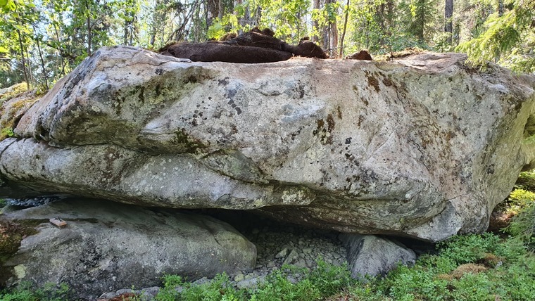 Standstart with left hand on the arete/nose and right hand in undercling/sidepull. The stone beneath the main stone is not included.