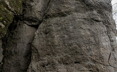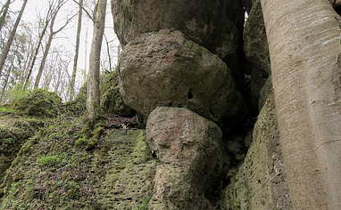 go straight ahead into the forest onto a small trail leading up the hill. Pass the rocks to the left and follow that trail. This sector stretches along this trail.