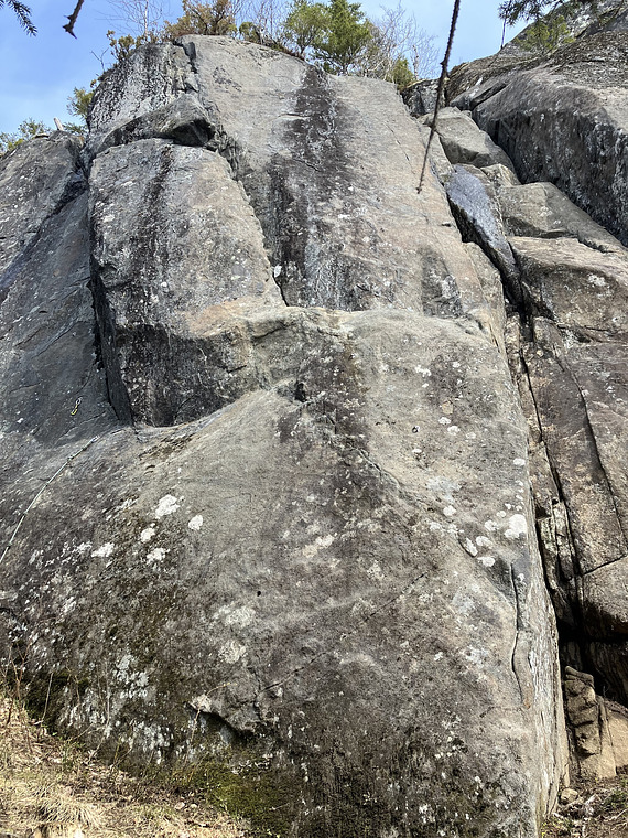 Up to a ledge, then up the slab. Route crosses "Bulldog" on the lower ledge. 8 bolts + 2 at the anchor