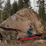 The faded red dot marks the main boulder and is the source of the name of the boulder and the best problem in the area - Rotpunkt. The boulder is just 50 meters from the road and the 6C "Rotpunkt" (vertical technical climbing on crimps) makes it worth a visit. The area also houses a handful of nice problems around 6B.