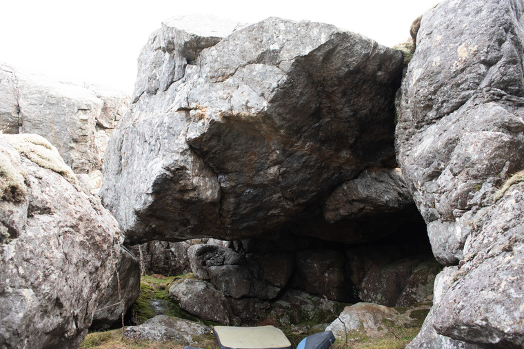 crouch start with the rock under the big roof. Climb out the roof with underclings into a thin crack