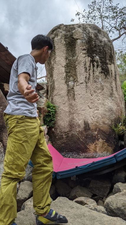 Start on the lower right side of the boulder. Only possible to climb during dry season