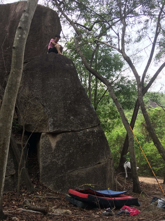 Start on the left side of the boulder and traverse all the way to the other side of the boulder