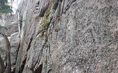 Klatrecrag med bare naturlige ruter. Ingen faste toppanker. Parkering på andre siden av veien litt mot hyggen.