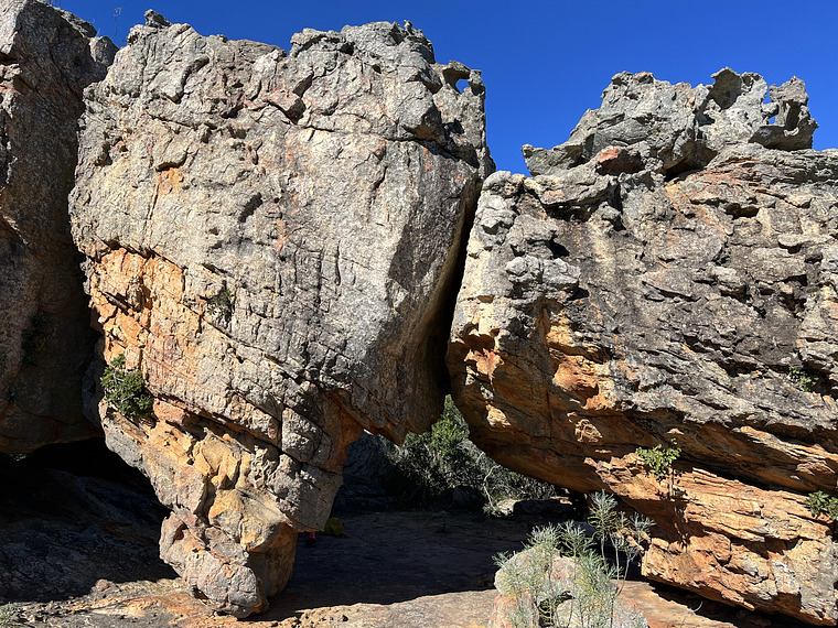 Start on orange rock and climb the face