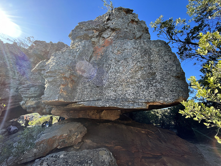Start on the jug in the back of the roof. Climb the roof to the lip and then up the centre of the slab. Finish to the right of the prow, avoiding hollow rock.