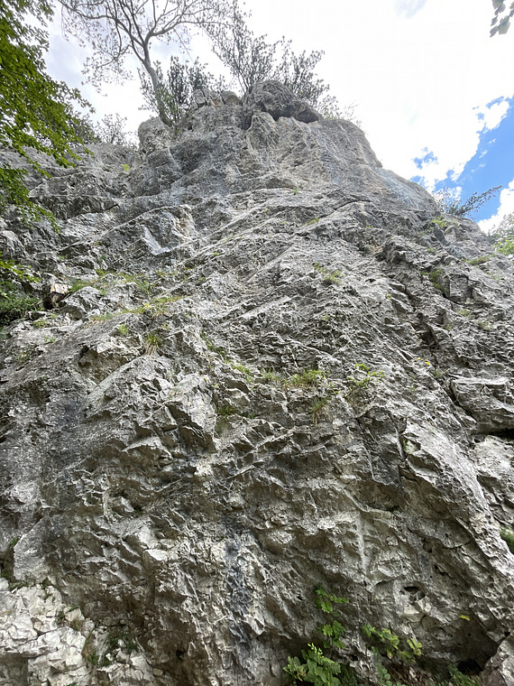 Einstiegsschrofen, dann durch eine kompakte Wand (Crux), dieser wird mittels Linksschleife durchstiegen (sechsten Haken einhängen und auf Höhe des fünften Hakens nach links). Anschließend schöner Ausstieg an der Kante.