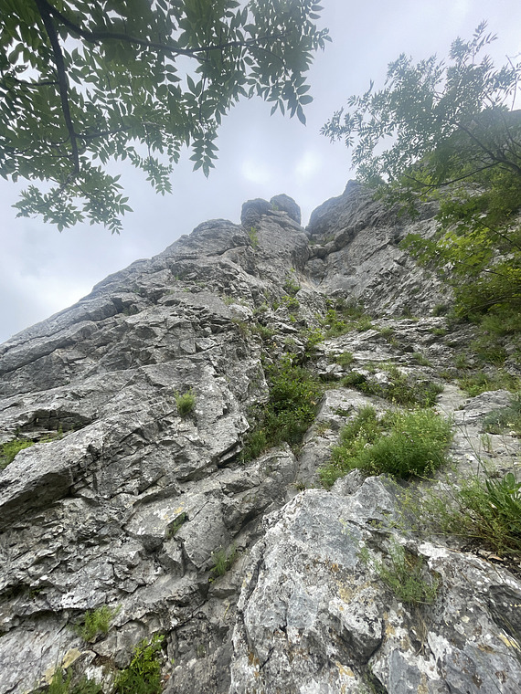 Anfangs an der plattigen Kante hinauf, nach dem Absatz links der Kante über das Loch (Crux), dann zurück an die Kante und an dieser (beziehungsweise etwas links davon) zum Umlenker.