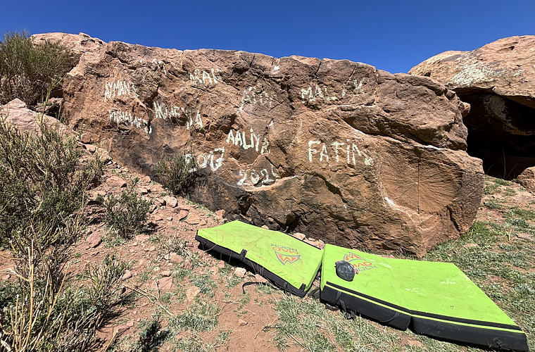 Sit Start low next to the graffiti "Aaliya" and climb direct.