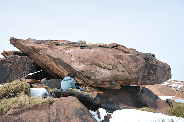 Sit start down under the roof on the right. Climb out of the roof and traverse to the left on the lip and mantle at the good hold.