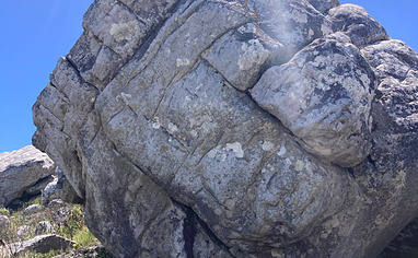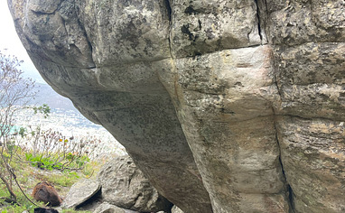 Access is the same as for Echo Valley. Park as for Echo, then walk up on the main Echo Valley path, passing Skobbejak, Light as Night, and carrying on up, through the little indigenous forest right to the top. Where the path splits just below the Groundswell / Shark Biscuit boulder, turn left (instead of right to the Amphitheatre). About 50m on, turn off left again - follow a small path over the rise. Last Blood will be the first boulder you come to.