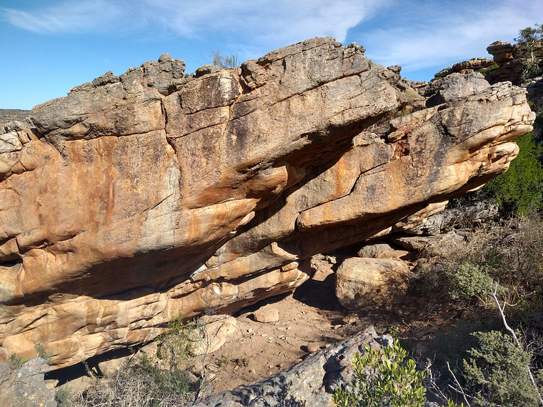 start in the lowest horizontal jug and make a few big moves between jugs, then to some crimps before a big move into the zig zag crack to finish. The first boulder climbed in Nardouw. An epic journey!