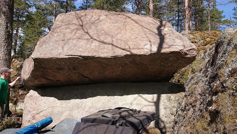 Stenen under är eliminerad. Grad såklart väldigt osäkert tills någon gjort FA. Start hängandes under på crimps, antagligen ut på läppen men eventuellt även gå under delvis.