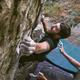 Start on the far right, traverse around the corner and top out on the overhanging section.