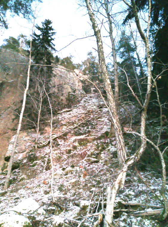 Pro3. Lähtee noin 5m Paska Lafka reitistä oikealle. Alku leikkauksesta, siirtyy släbille, josta leikkausta/halkeamaa pitkin ylös. 15m