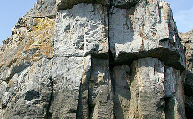 Continue a couple of hundred metres past the second fence from the St Govan’s car park and cut across to the cliff-top shortly before the prominent grassy headland of Crickmail Point. It is helpful to view the cliff from the west to locate the start of Pigs on the Wing and the popular line of Galactic Co-ordinator, which bounds the main upper prow on the left.