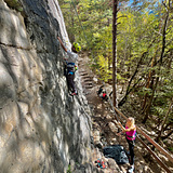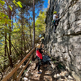 Attention: small rocks may occasionally fall from above, as the steep forest slope above the crag is frequented by wildlife. Wearing a helmet is advisable.