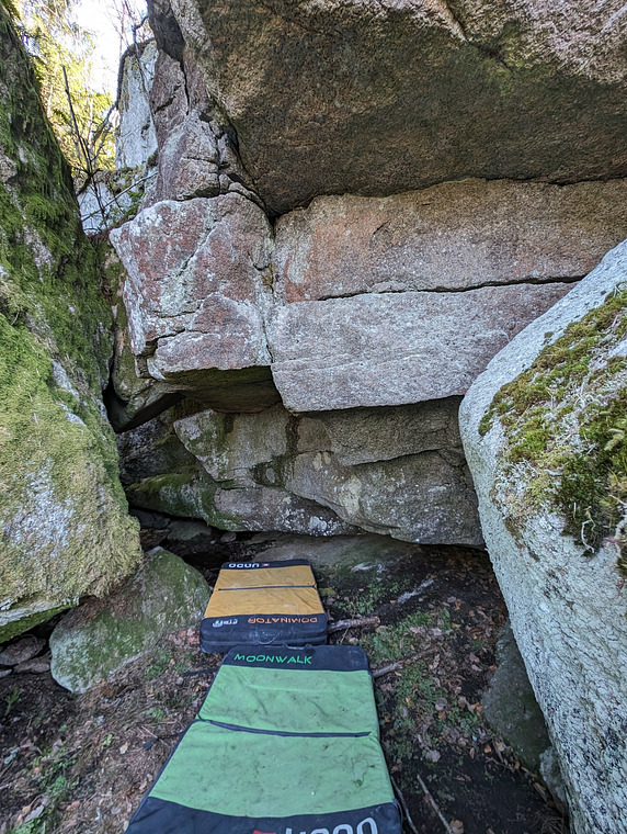 Sit start on ledge. Follow ledges out of cave until final jug. Top hold finish