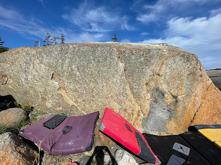 Sitstart on flake at left side of the wall. Traverse right on small crimps and top out in …lala.