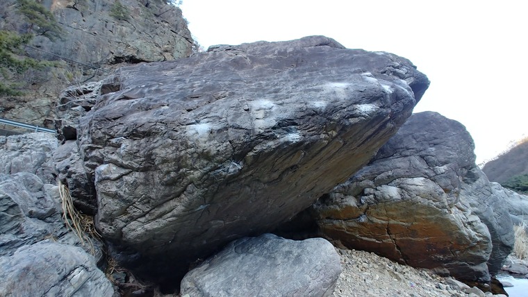 아랫단 바위 이용해 일어선 뒤 우측 슬로프를 잡고 왼손 다이노.