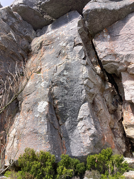 Climbs the arete, onto the face, finishing on the jug ledge with the plant