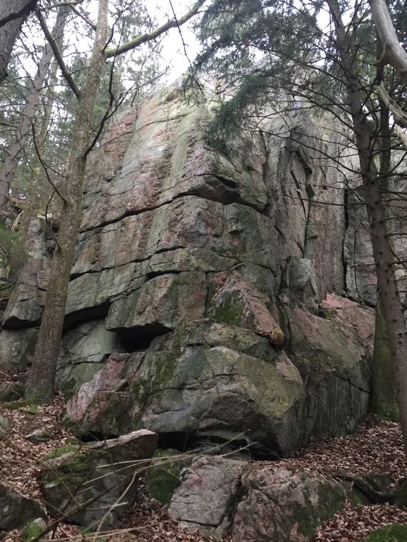 Starta precis till höger om tydlig vertikal spricka. Följ kanten till hyllan och avsluta sedan med runda sva formationer till nästa hylla (Sista biten gemensam med leden till höger). Kamsäkring. Ankare. 13 m.