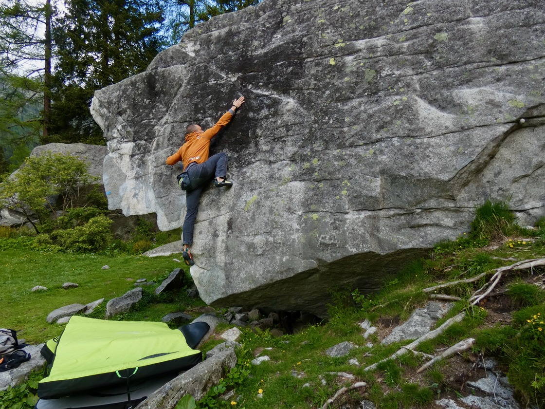 Let’s spend a few more words to describe the climbing in Daone. You can find almost every style in the valley since the amount of boulders is crazy. High-balls, slabs, powerful overhangs, slopers, crimps, perfect cracks and knobs. Yes, the knobs are particular holds having the shape of small mushrooms that are characteristic of Daone’s granite. There are also some sector with sport routes and multi-pitches. One final note: do not come during rainy days, cause the problems could be wet. Daone is a fairly humid valley and the shady boulders take some time to dry. But do not worry, those exposed to the sun dry very quickly!