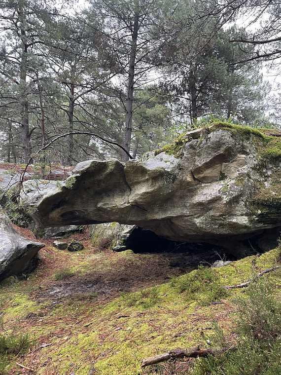Eliminate: Without the good holds on the right side, which are used for Vipère Œil Gauche. Sit start under the overhang with big pockets and climb out over the head of the "viper".