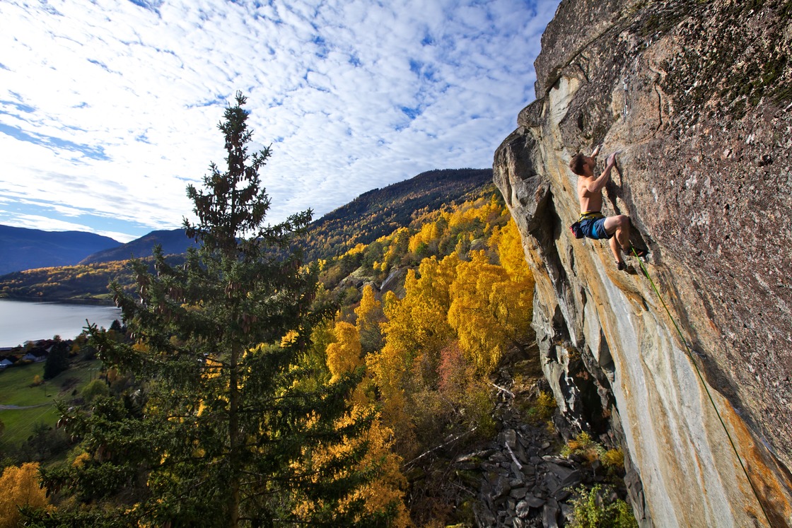 This is the West part of Kvam. Here you will find a bit of everything. Long pumpy routes that never gets wet, long slabs or lots of trad routes. Some sectores are in the middel of the wall that require rapping Down from above.