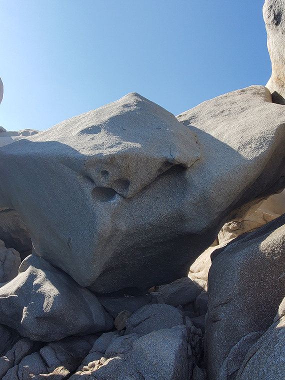 stand start, both hands at lowest hole on the right side (you can see where it is chalky in the picture) with high feet, go to the right, then up along the flake to top out. Bring a lot of mats, a lot of friends or a very good spotter :-) - dangerous landing!