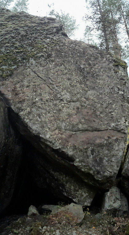 Lähtö luolasta halkeaman irtokivestä kaksin käsin. Pysyy keväällä pitkään märkänä alla olevan lätäkön vuoksi.