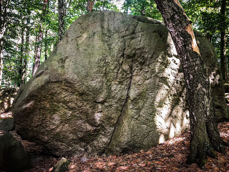 Ze stoje, na hrane z madla v urovni hlavy, traverz do prava bez horní hrany a chytů hodně nahoře, výlez za stromem na tupé hraně Poznámka: kámen naproti morčeti, pro delší asi lehčí