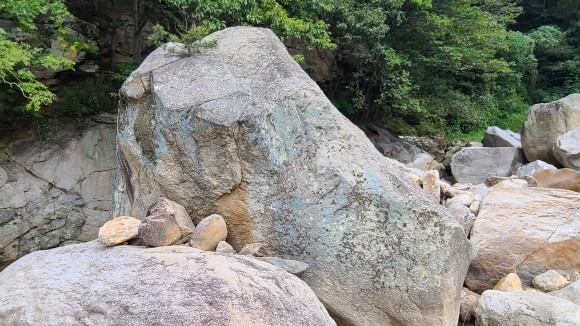 슬랩면을 따라서 소나무 쪽으로 올라감. 손 홀드는 적으나 완만한 슬랩.