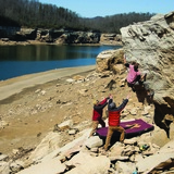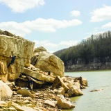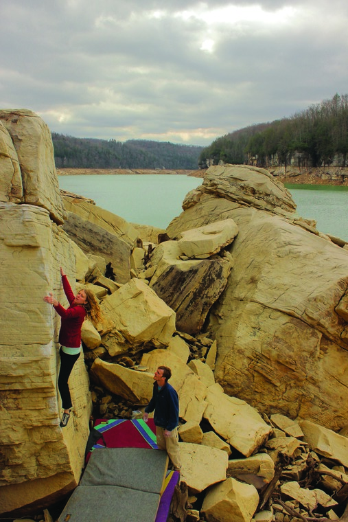 Whippoorwill is only in season in the winter. The US Army Corps of Engineers manages Summersville Lake, and every fall they release the dam (causing the Gauley River to rage and an influx of boaters to the area), and every spring they stop up the dam. In the summer Whippoorwill is deep underwater, but in the winter the alien landscape of the dry lake bed is yours to explore. And you should explore it. There are many, many more boulders at Whippoorwill than documented here, but be warned: due to the fact that it spends lots of time submerged, this sandstone is more porous, and therefore more prone to breaking, than most sandstone in the New River Gorge area.