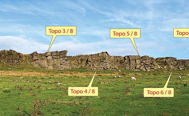 Approach: The crag overlooks the village of Kettleshulme, which is situated on the B5470 Whaley Bridge-to-Macclesfield road. Approaching from Whaley Bridge, approximately 300m after passing a signpost marking the boundary of Cheshire, turn left onto Clayhall Road (signposts for Goyt Valley and Saltersford) and follow the narrow lane steeply uphill for about 2km to park in lay-bys directly below the crag. Approaching via Macclesfield it is quicker to turn right onto Side End Lane (the first right turn on entering Kettleshulme) and follow this to its junction with Clayhall Road. From the parking area, cross the stile and follow the fenced-in walkway to the base of the crag (2 minutes).