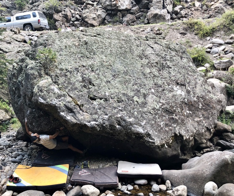 Start far right of the boulder. Right hand on a sloppy crimp above your head left on the small crimp rail that you heal hook on. Go left and up.