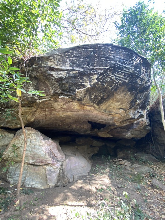 Jumpstart on a jug left of the tree, go straight up to top-out on upper right crimp rail. (Campus challenge v6)
