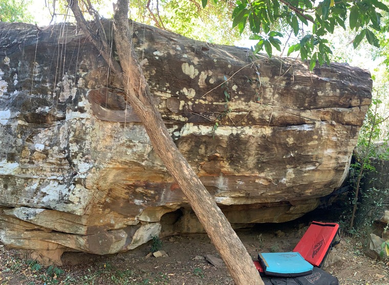 start on arete with good holds and high foot and climb straight up on slopey holds, exit to the left good ledge, can be sandy, brush it first and clean the exit