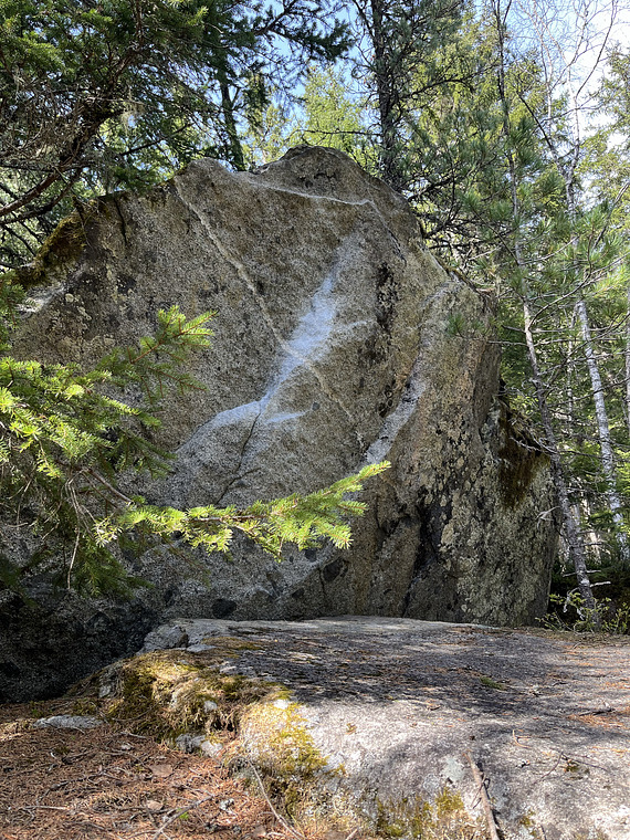 Sit start on bottom part of crescent shaped hold Boulder is found on top of 'Lucky'
