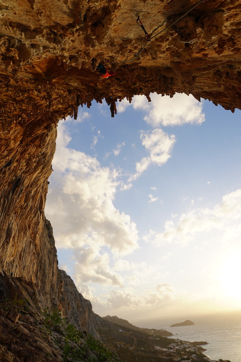 Tim making his way up the tufa roof.