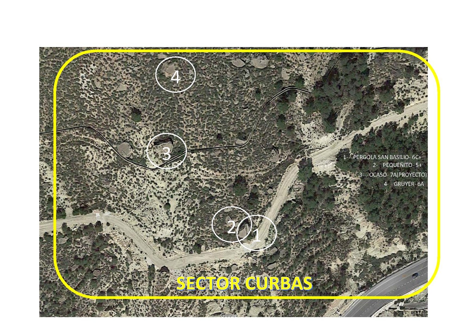 Visa de Pajaro del Sector curbas, con 4 bloques identificados, y se aprecian muchos que faltan por limpiar