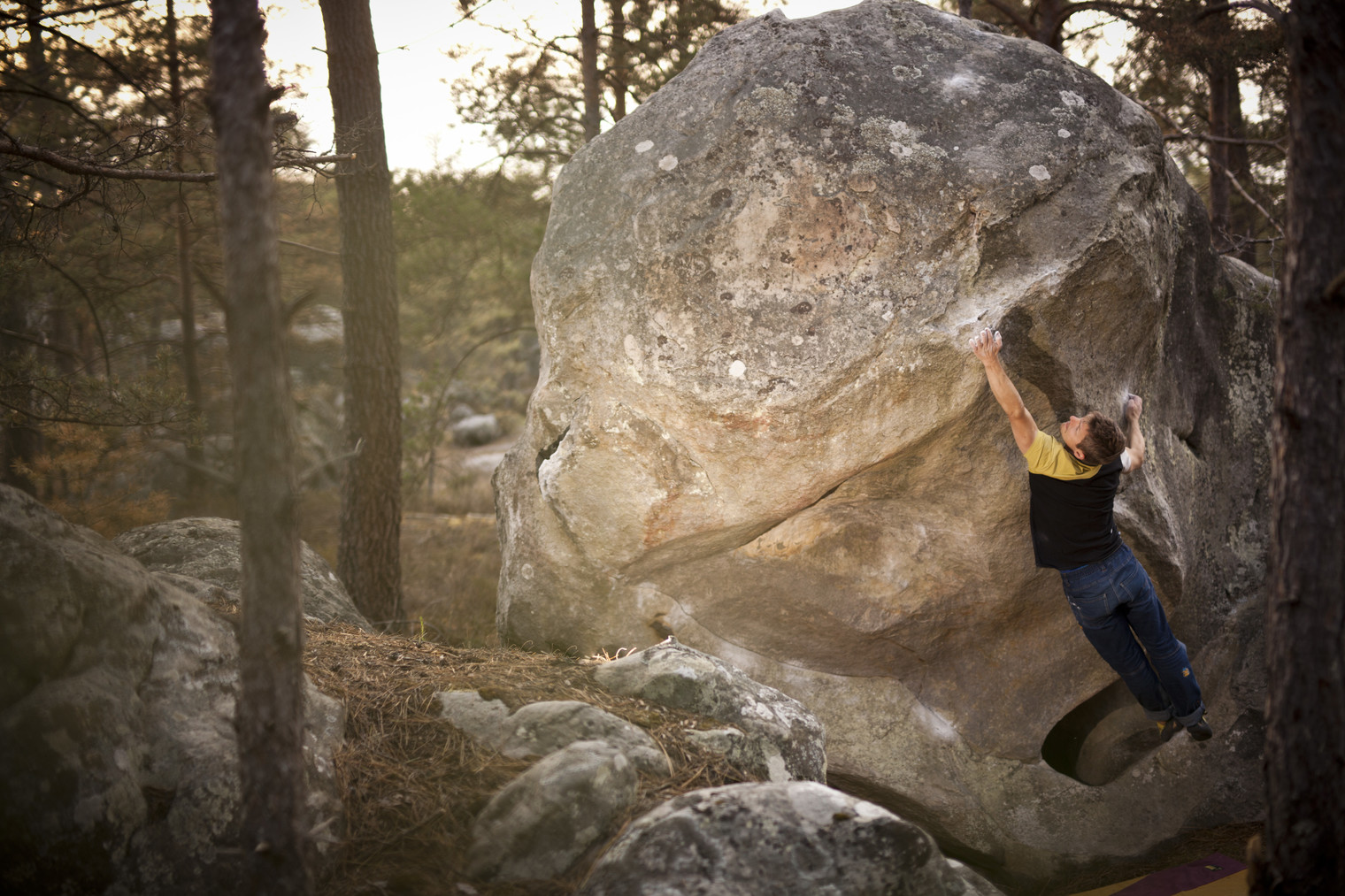 Heikki on the dyno of L'Envolée Tibétaine assis 7A+