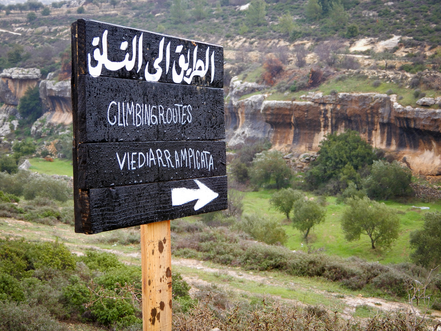 This sign points the way to the climbing from the parking area.