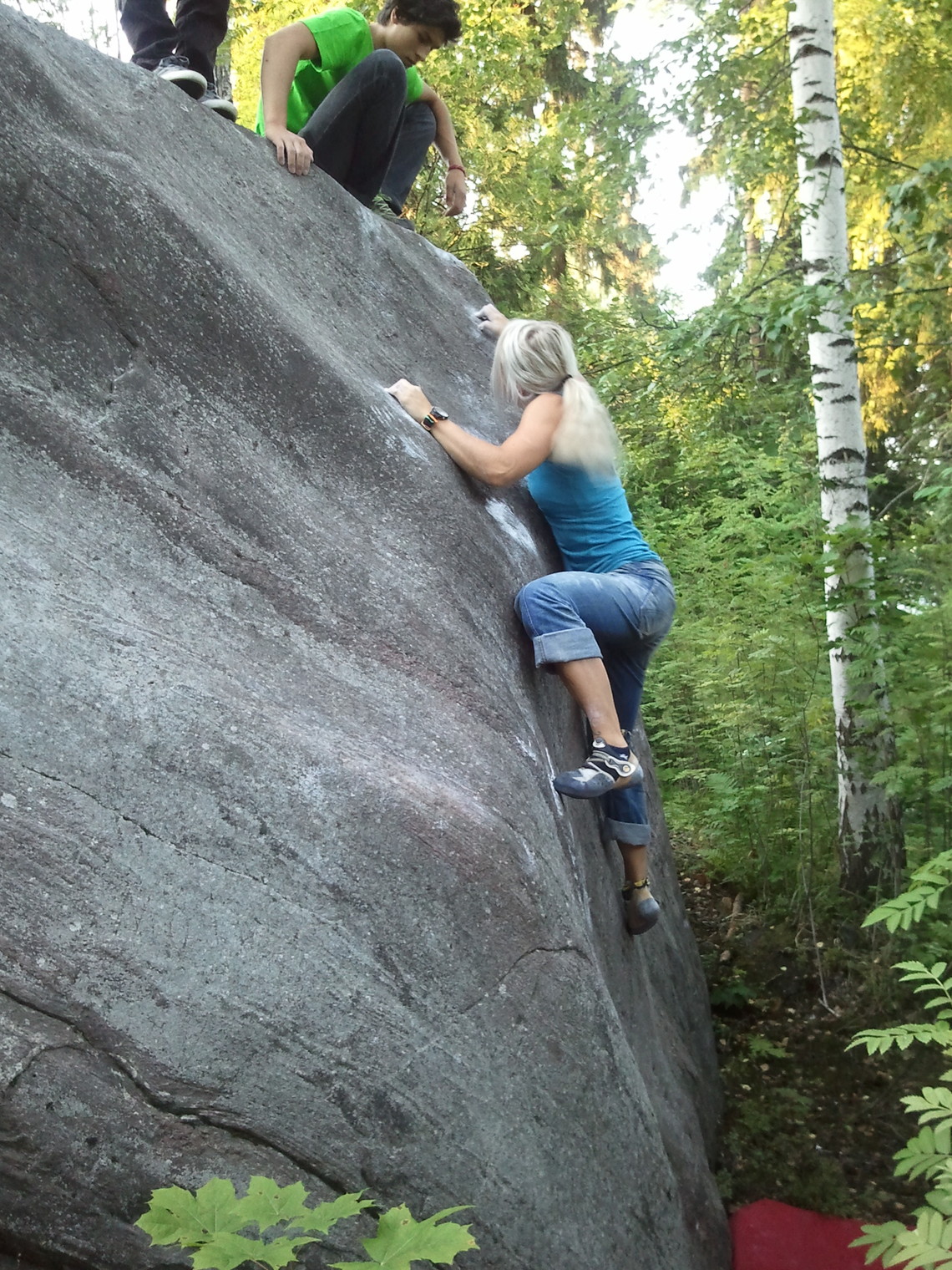Niini climbing Andyn släbi and Andy showing her the holds.