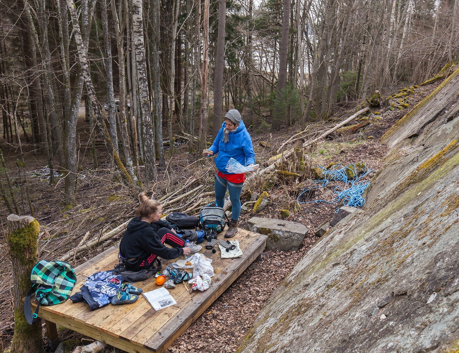 At the base of the crag.