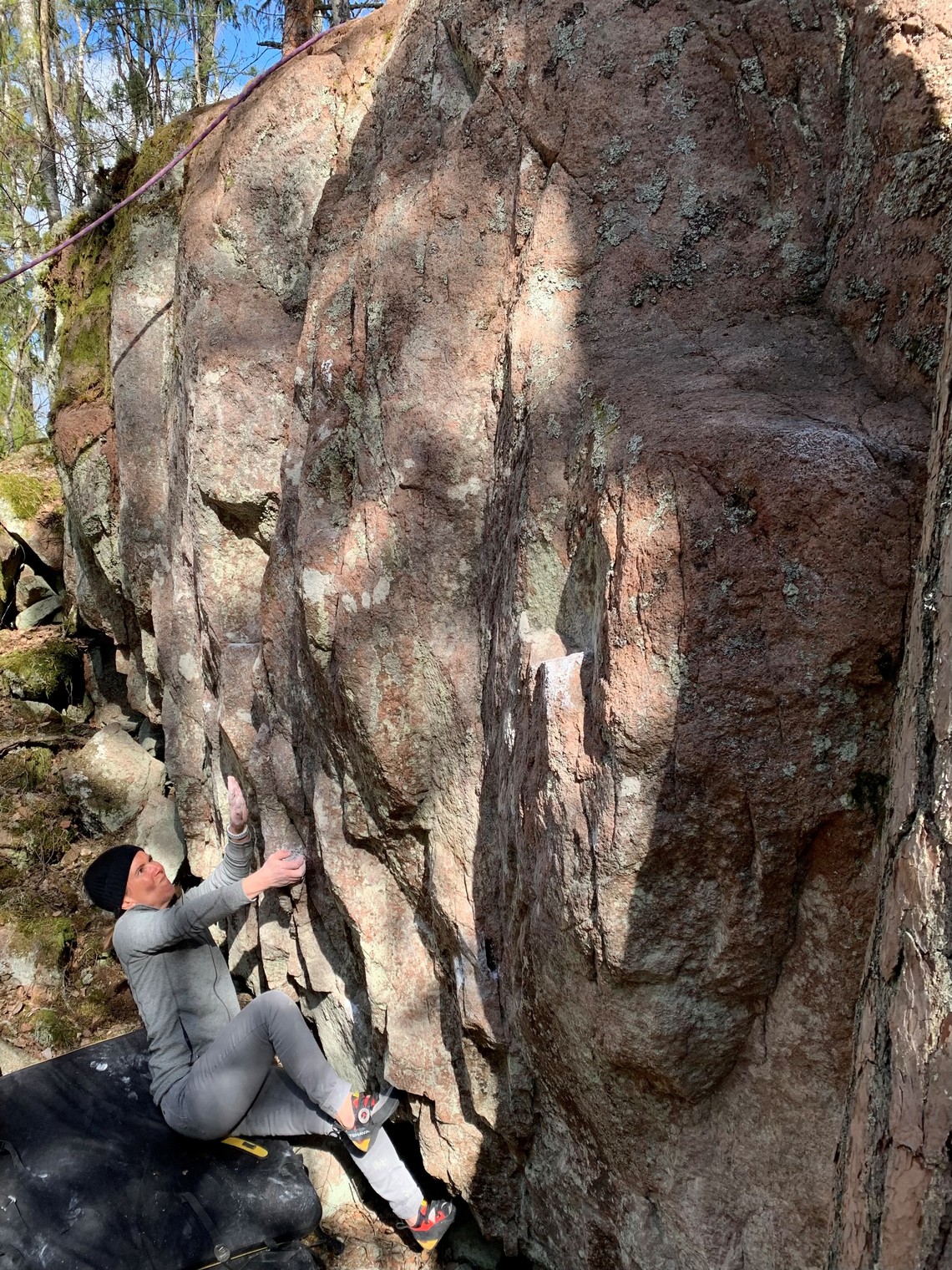 "Eldskärm" 6A. På Sektor "Tjabo" ca 20 m NV om sektor "Bloccoloó". Sittstart. TV om problemet "Tjabo 75 bast"