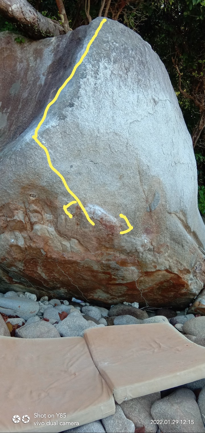 Sit start. Big through with the left hand to a slipper follow by matching the right hand. After heel hook of the start hole reach the next side vertical shallow grove with right hand. Bring your body to the far right and top out at the dead tree.