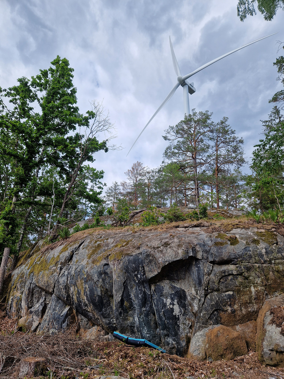 The small overhanging boulderwall wsith the wind turbine close by