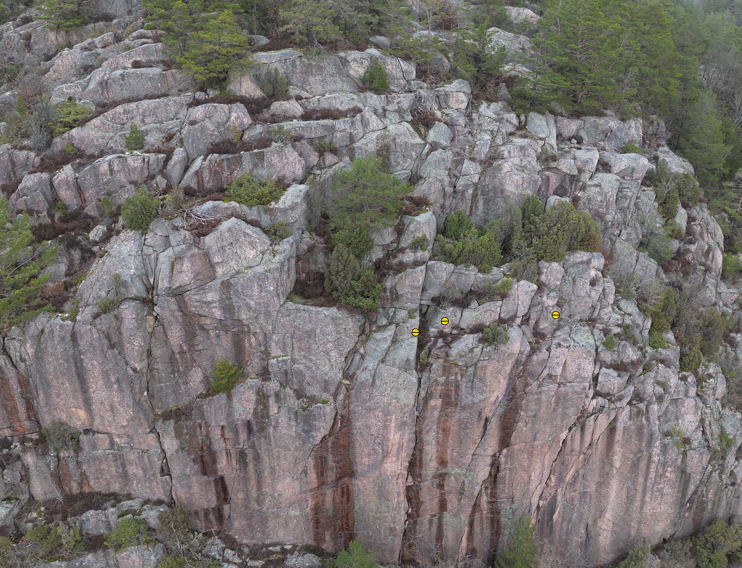 Top-down view for top-rope access navigation with markers for bolted anchors.