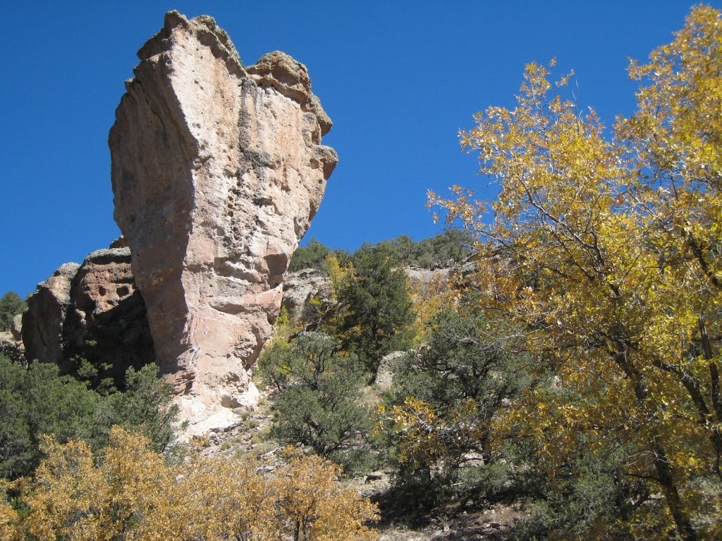 The Enchanted Tower surrounded by fall colors. Golden Stairs goes up the black streaks in the sun.